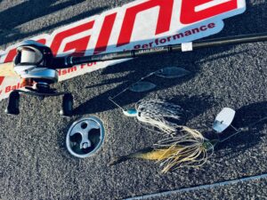 続いて沖ウィードフラットのハスが絡むシチュエーションを、3mクランク&3/4ozヘビースピナーベイトでトライ。