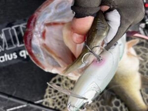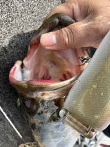 口の外にフッキングで冬の状態での食い方。春の頭に切り替わると口の中にストライクしてきます。