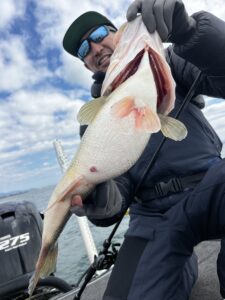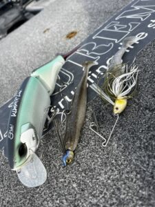 風が吹いたり水温が上がらない場合はスイムジグ系、風もなく温まり安定したらビッグベイト、というローテーションでゲームセレクトしていきました!