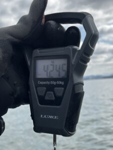 スイミングマスター3/8oz+ヴァラップスイマー4.2のコンビネーションにて、59.5㎝4245gのBIGママ出現。