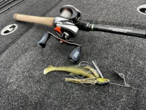 順調に水温を上げていくための天候状況でないため、サカナを引っ張り上げるBIGベイトゲームよりも、サカナのポジションに近くを長時間トレースできるグラスピースFLEXやヘビースピナーベイト、スイミングジグをメインに時間をあてていきました。